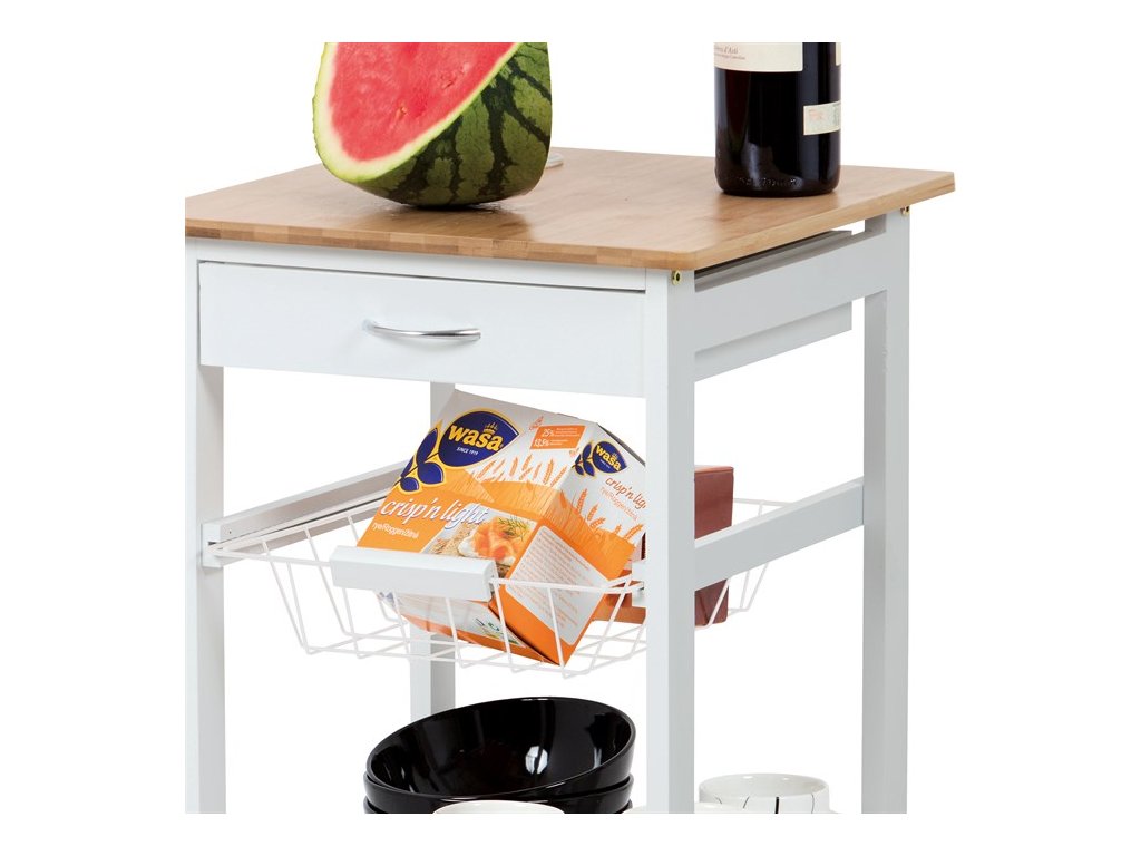 Praktičnost stolku zvyšuje zásuvka s kovovou úchytkou na drobné předměty, drátěný košík pro potraviny nebo ovoce a dvě police, které nabízí prostor pro nádobí, lahve či kuchyňské doplňky. Pojezdová kolečka s brzdou umožňují snadnou manipulaci i stabilní umístění na jednom místě. SIESTA tak představuje ideální řešení pro každou kuchyni či jídelnu, kde je potřeba spojit funkčnost s estetikou.
