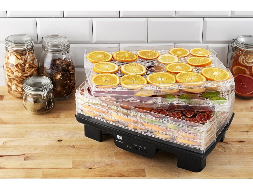Usazení ventilátoru, výborně řešená sušící plata a navíc možnost jejich výškového nastavení garantuje rovnoměrné a rychlé sušení. Materiál sušících plat vám zase dopřeje jednoduché vyndání usušeného ovoce i zeleniny. Suroviny k platům nepřilnou, snadno je proto oddělíte.