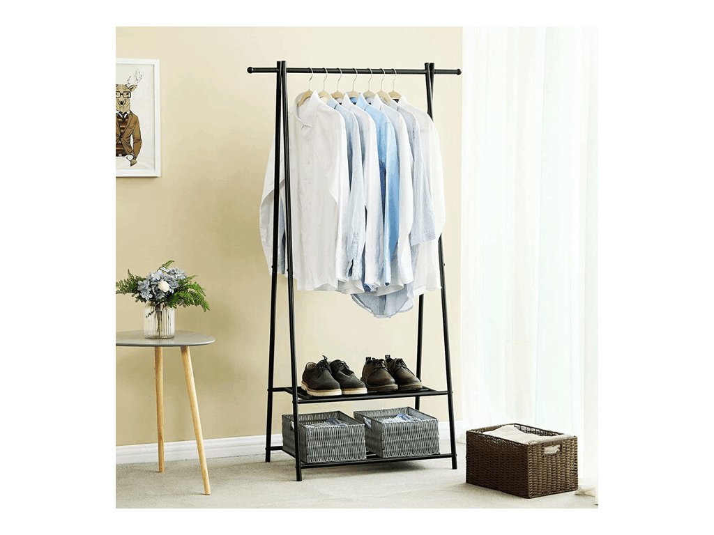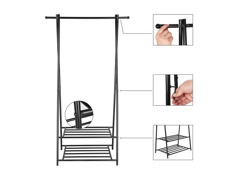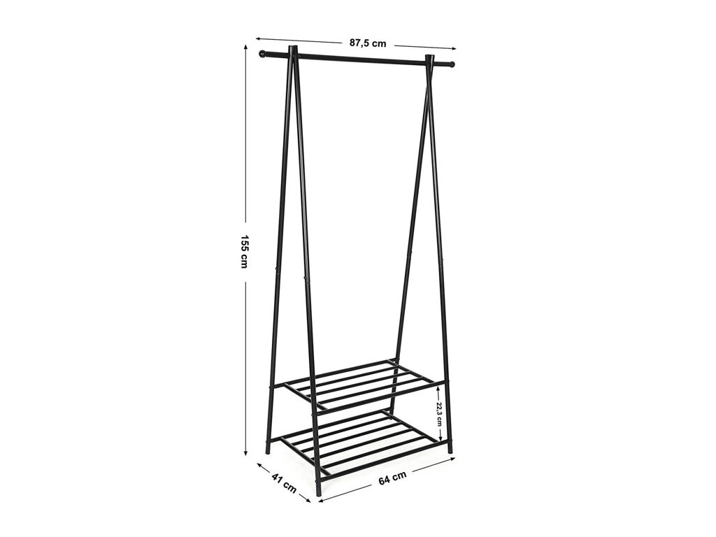 Kovový věšák na šaty v černém provedení nabízí praktické řešení pro uspořádání oděvů i obuvi. Robustní rám je tvořený práškově lakovanými trubkami, které zajišťují stabilitu a dlouhou životnost. Věšák je vybaven horní tyčí pro zavěšení oblečení a dvěma policemi s roštovou konstrukcí, které umožňují odkládání bot nebo dalších doplňků. Díky jednoduchému designu a kompaktním rozměrům se hodí do předsíní, ložnic i šaten, kde pomáhá udržet pořádek a přehlednost. Celková nosnost odpovídá pevnosti materiálu a konstrukce umožňuje snadnou montáž i údržbu.