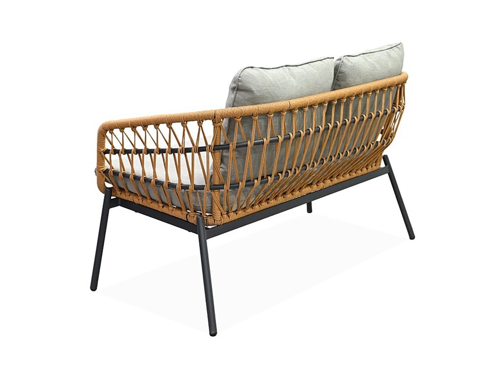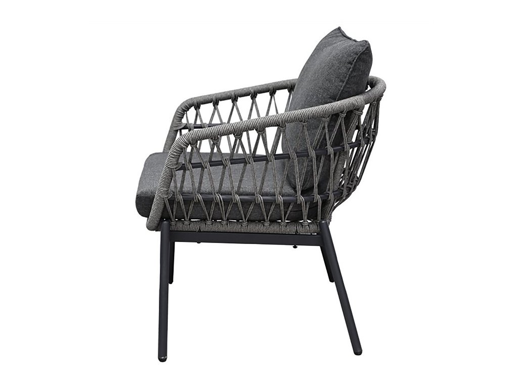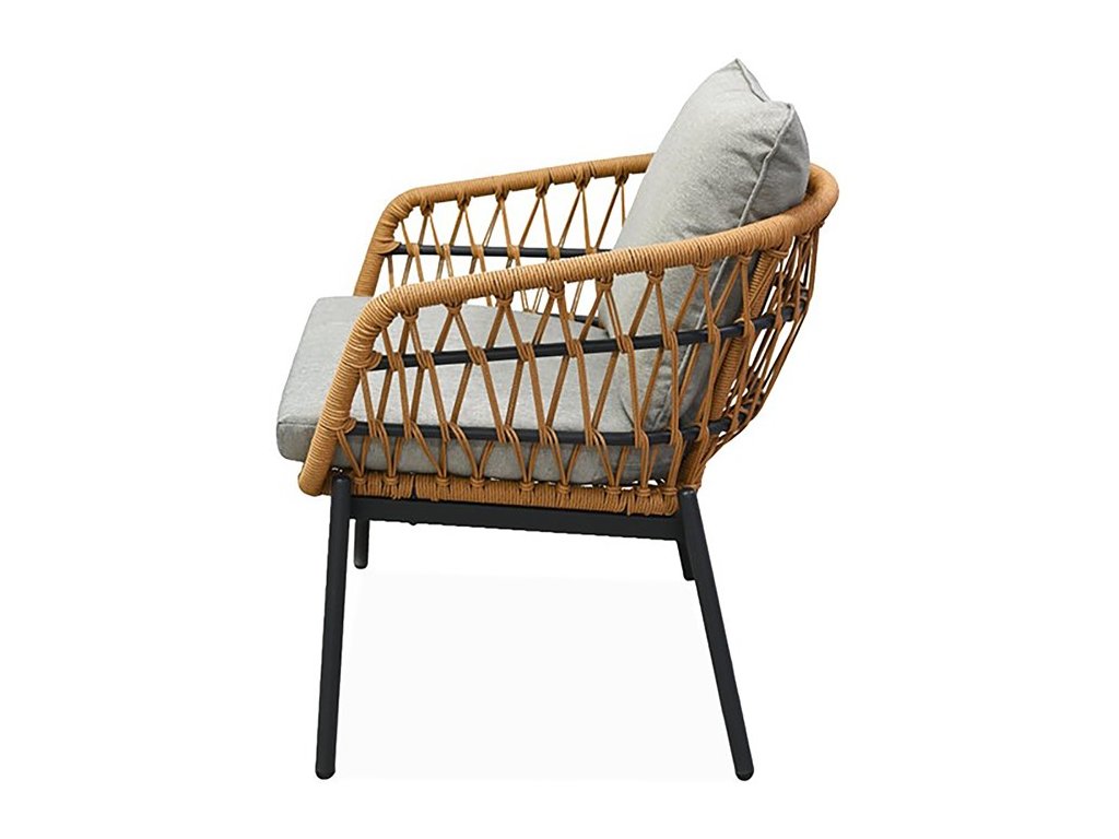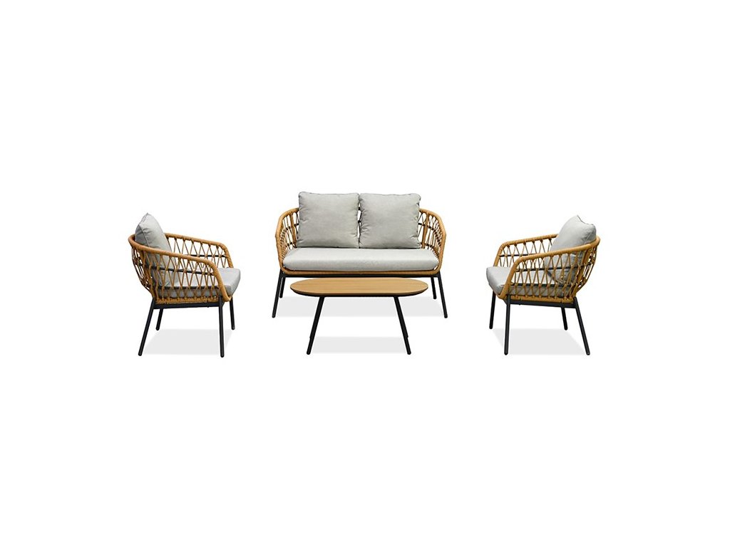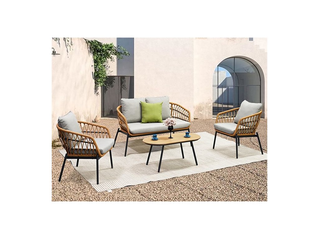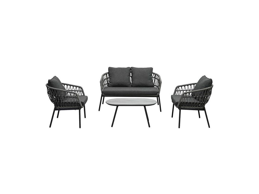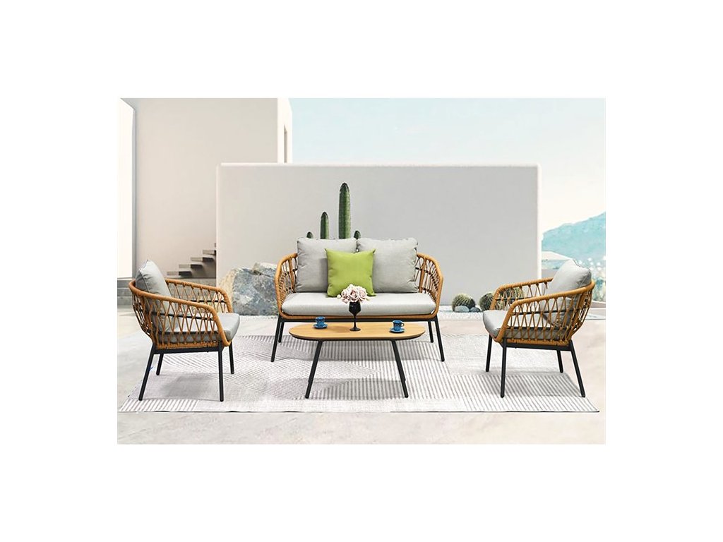 Souprava je vyrobena z kvalitního polyratanu, který vyniká odolností proti povětrnostním vlivům a zároveň působí elegantně. Stabilní konstrukce z kovu s práškovou povrchovou úpravou zajišťuje pevnost a dlouhou životnost. Voděodolné polštáře poskytují pohodlné sezení i při každodenním používání venku. Stolek je osazen deskou z polywoodu, která je nenáročná na údržbu a odolná proti počasí.
