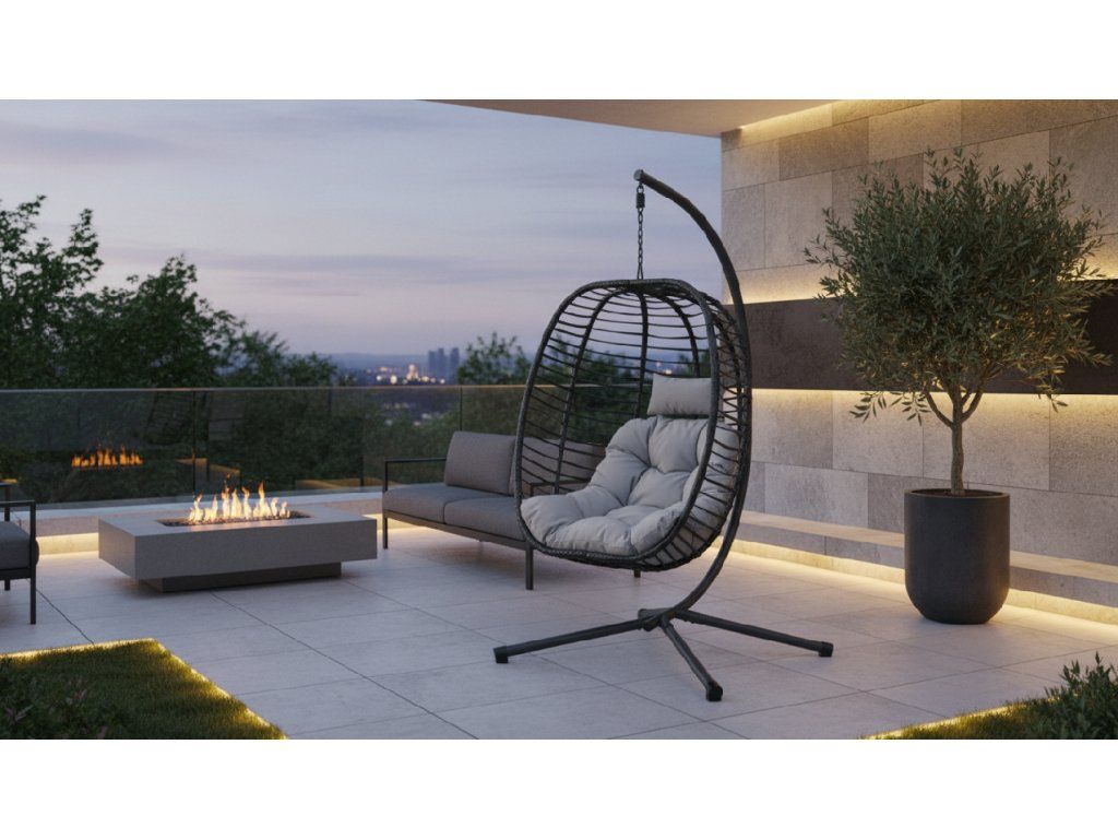 Závěsné křeslo ZANELLY přináší stylový a pohodlný prostor pro relaxaci na zahradě, terase i balkoně. Elegantní polyratanový výplet v antracitové barvě doplňuje pevná kovová konstrukce, která zajišťuje stabilitu a dlouhou životnost. Měkké světle šedé polstrování poskytuje vysoký komfort při odpočinku. Díky závěsnému provedení si můžete užívat příjemné houpání a maximální relax.