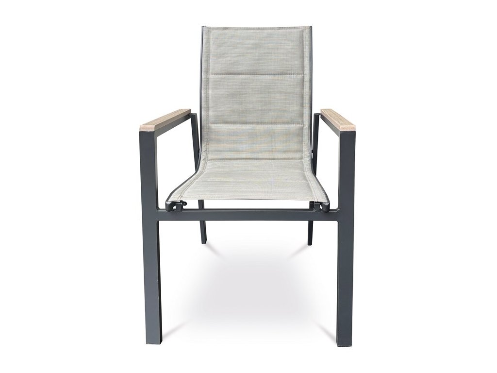Sedák i opěradlo jsou potaženy kvalitním textilem s pěnovou výplní, která poskytuje pohodlné a ergonomické sezení i při delším posezení venku. Moderní design a barevné varianty s černými nebo šedými nohami snadno zapadnou do každého exteriéru.